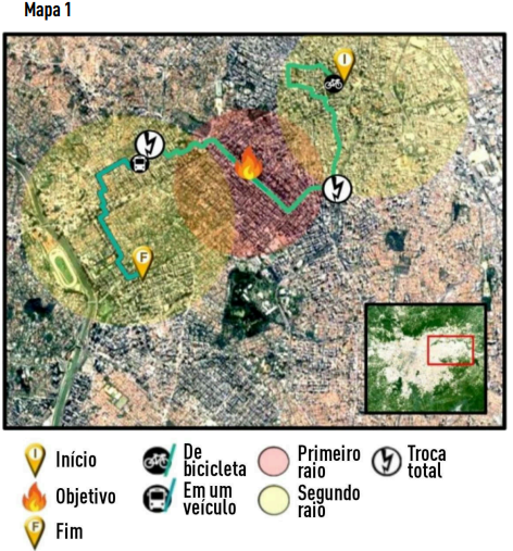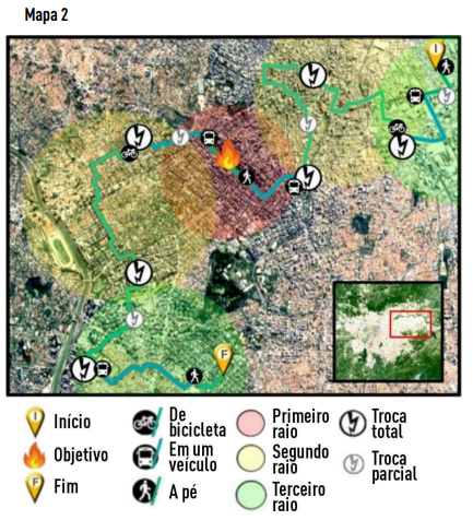 Observamos um ponto de Início, um Objetivo e um Fim, que estão conectados por una longa rota que os atravessa. Por sua vez, observamos um primeiro e segundo raio, que correspondem a grandes áreas que representam certos graus de risco-segurança, dado sua proximidade-distância ao objetivo. Além disso, temos um ponto de Troca Total na rota da ida ao Objetivo e outro ponto de Troca Total na rota de volta, na retirada.